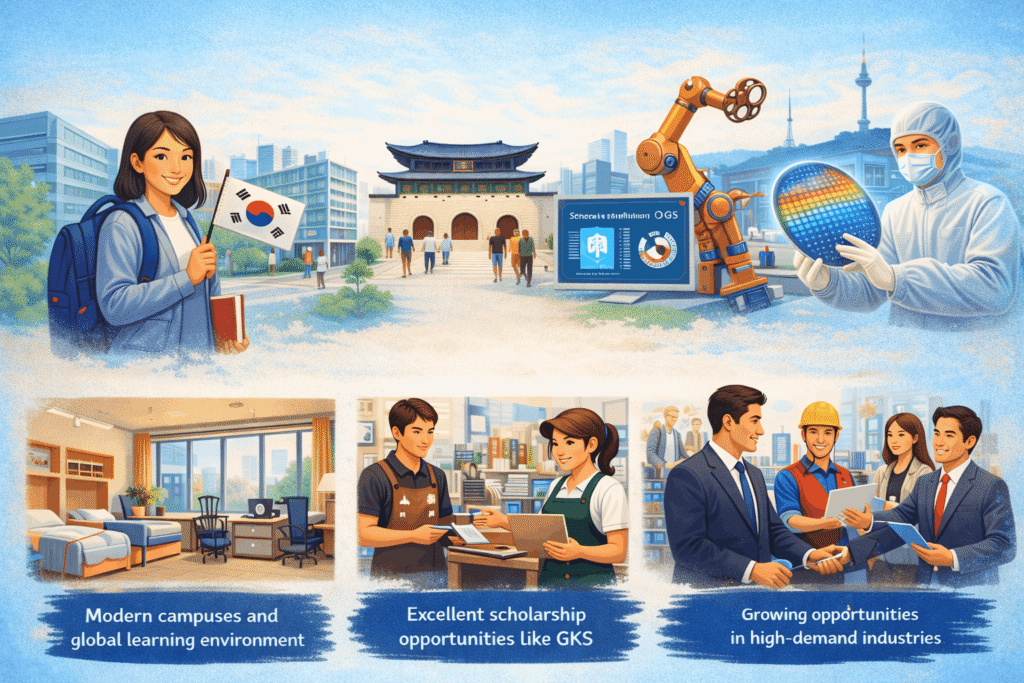 Discover world-class education, modern campus life, affordable accommodation, part-time work options, post-study work pathways, and the prestigious Global Korea Scholarship.