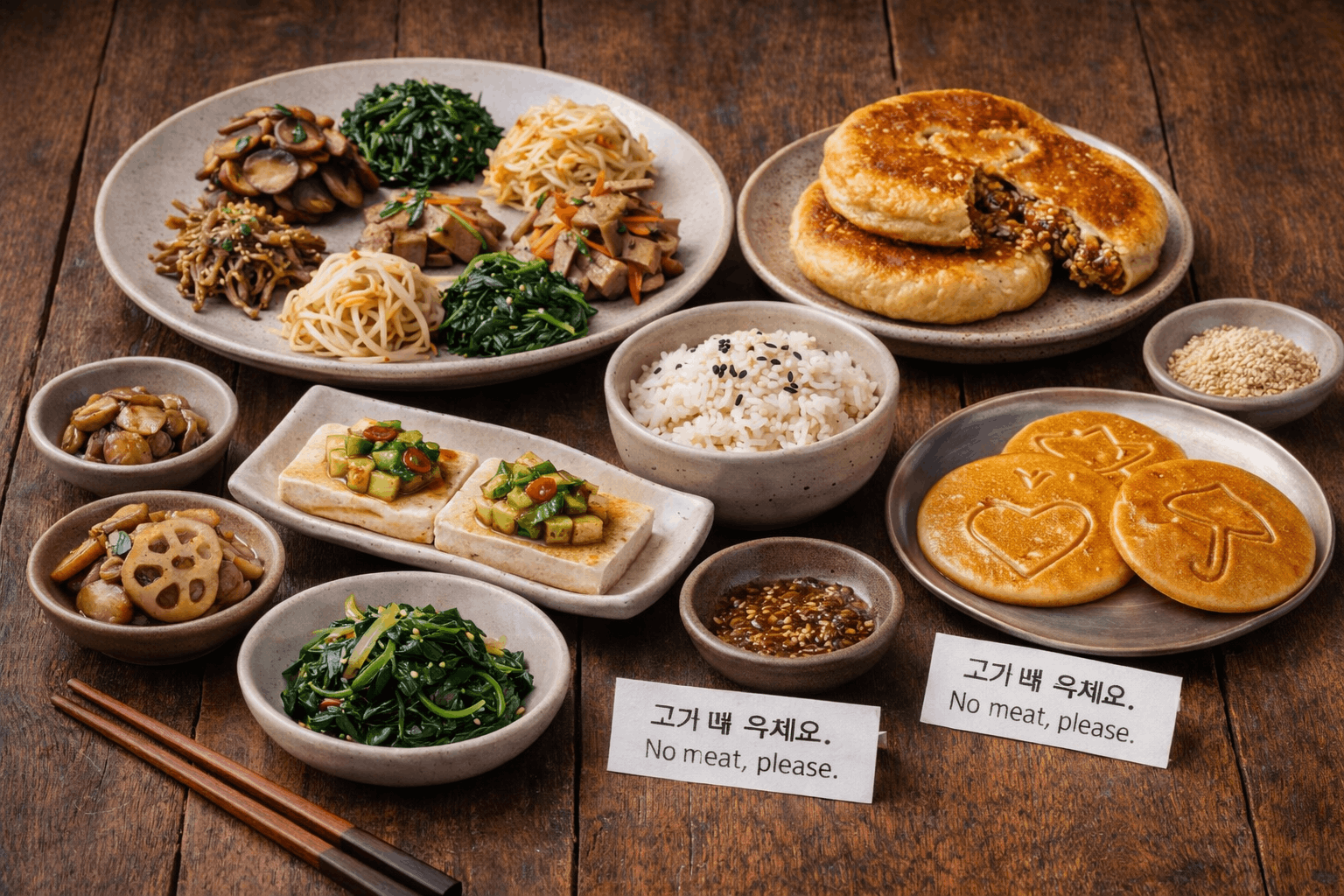 Korean cooking commonly uses sesame oil, soy sauce, chili paste, fermented soybean paste, vinegar, and black bean paste. Since some dishes may include fish sauce or meat broth, vegetarians should always request no fish and no meat when ordering.